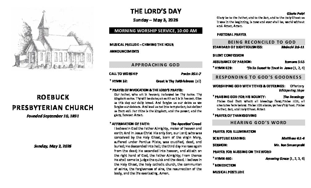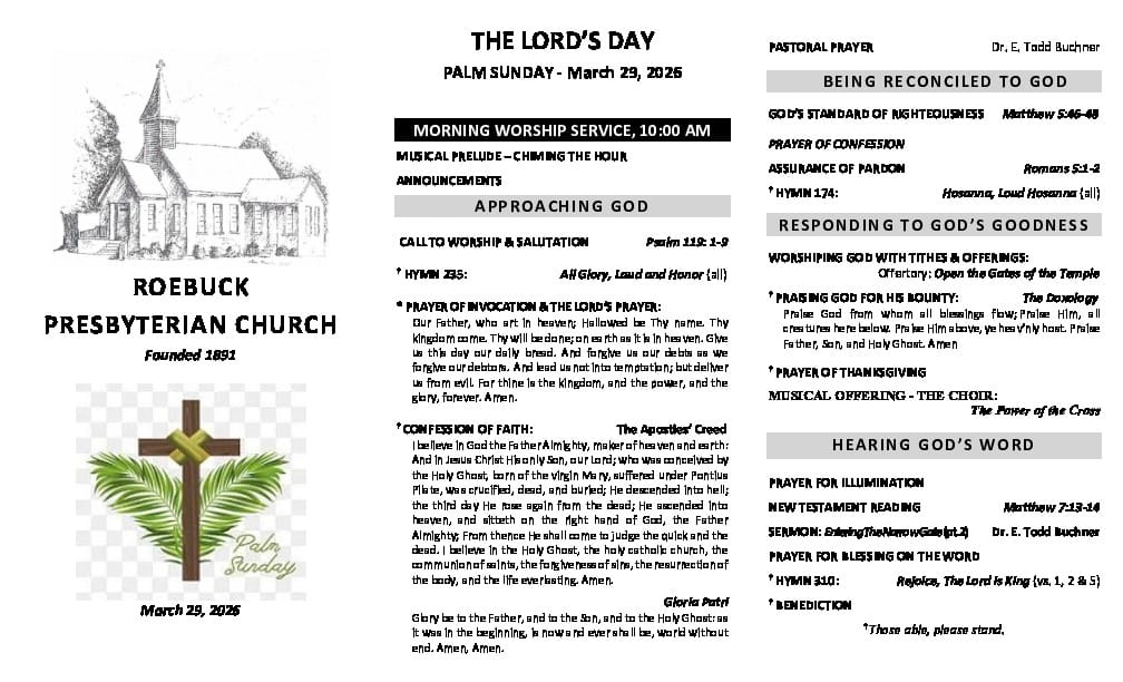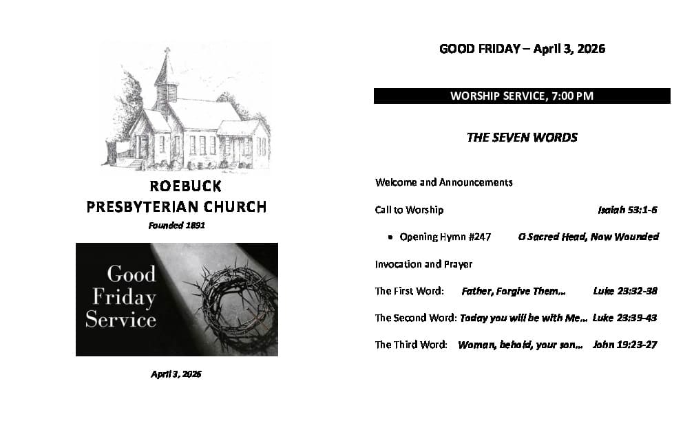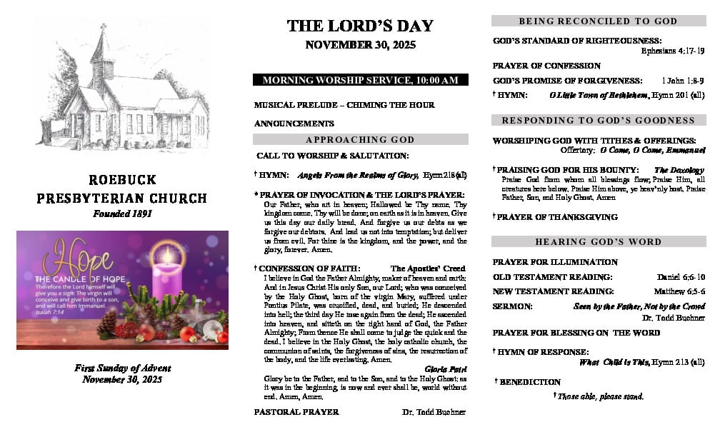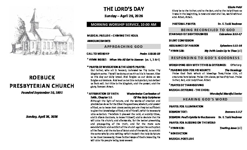 Roebuck PCA is a member congregation of the Presbyterian Church in America (PCA), a theologically conservative, Bible-believing denomination.